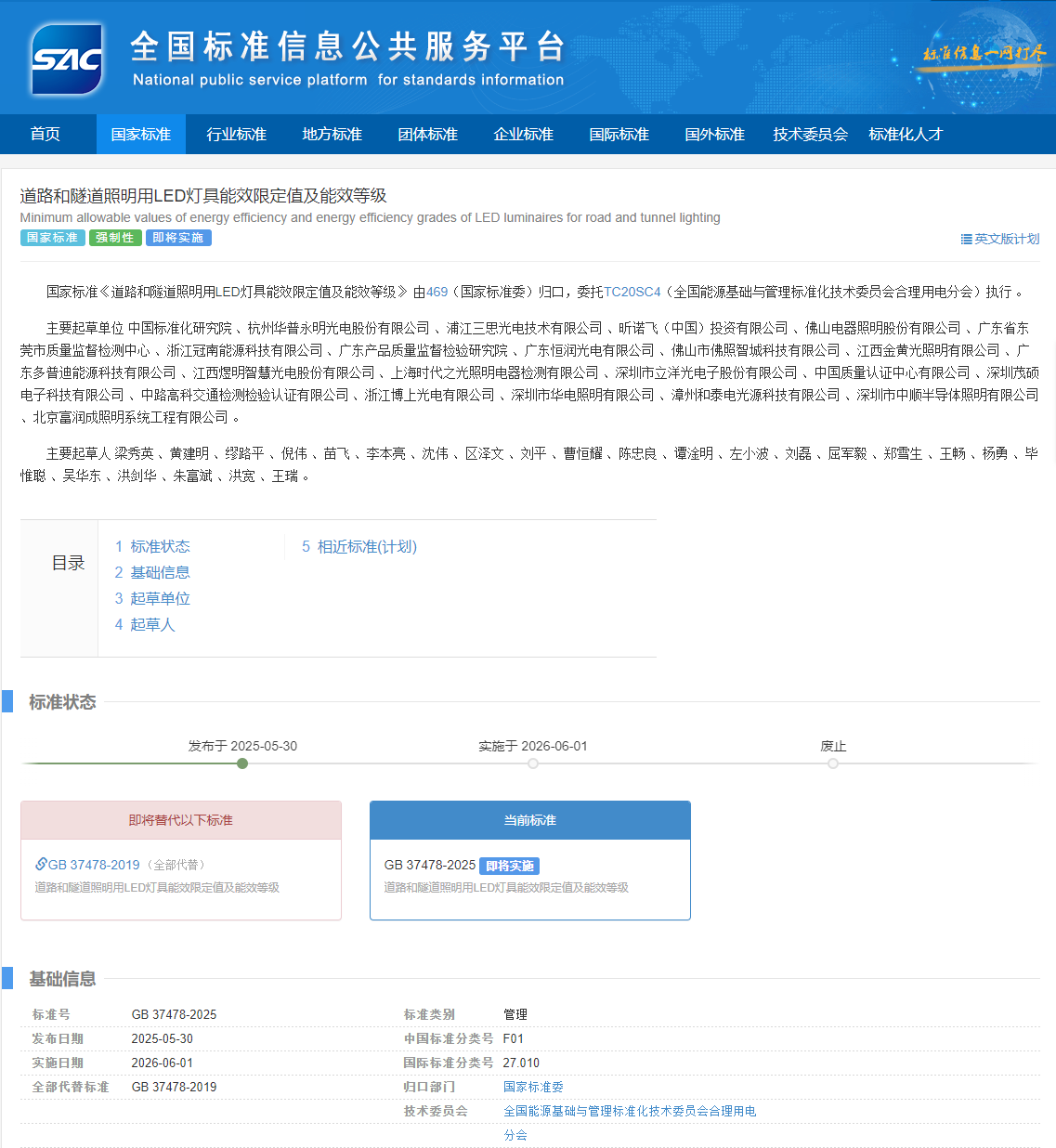 值得关注的是,qy·球友会(中国)电子参与编制的另一项国家标准《道路和隧道照明用LED灯具能效限定值及能效等级》,已于2025年5月30日发布,将于2026年6月1日正式实施。该标准由国家标准委归口、全国能源基础与管理标准化技术委员会合理用电分会执行,顺利获得设定强制性能效限定值与清晰分级门槛,倒逼低效产品退出市场,持续有助于产业向高效节能、绿色低碳转型。
